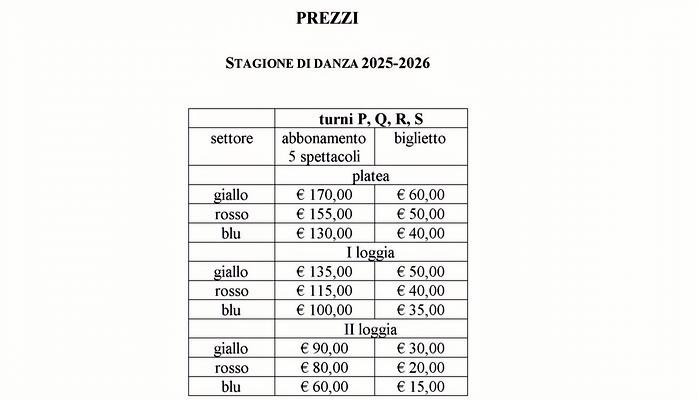 La Stagione di danza 2025-2026 prevede quattro nuovi turni di abbonamento (P, Q, R, S), per cinque spettacoli ciascuno.