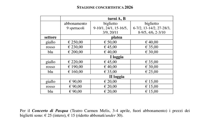 Da sottolineare, inoltre, la possibilità di acquistare da martedì 16 dicembre 2025 i biglietti per tutti gli spettacoli della Stagione concertistica; lo stesso servizio è possibile anche online attraverso il circuito di prevendita www.vivaticket.it.